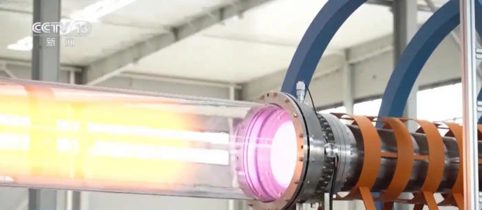 这是强流直线等离子体装置“赤霄”,每平方米每秒钟可极速喷射出10的24次方——即亿亿亿个粒子,一次可连续运行24小时以上,对新研制的“人造太阳”壁材料进行充分检测。