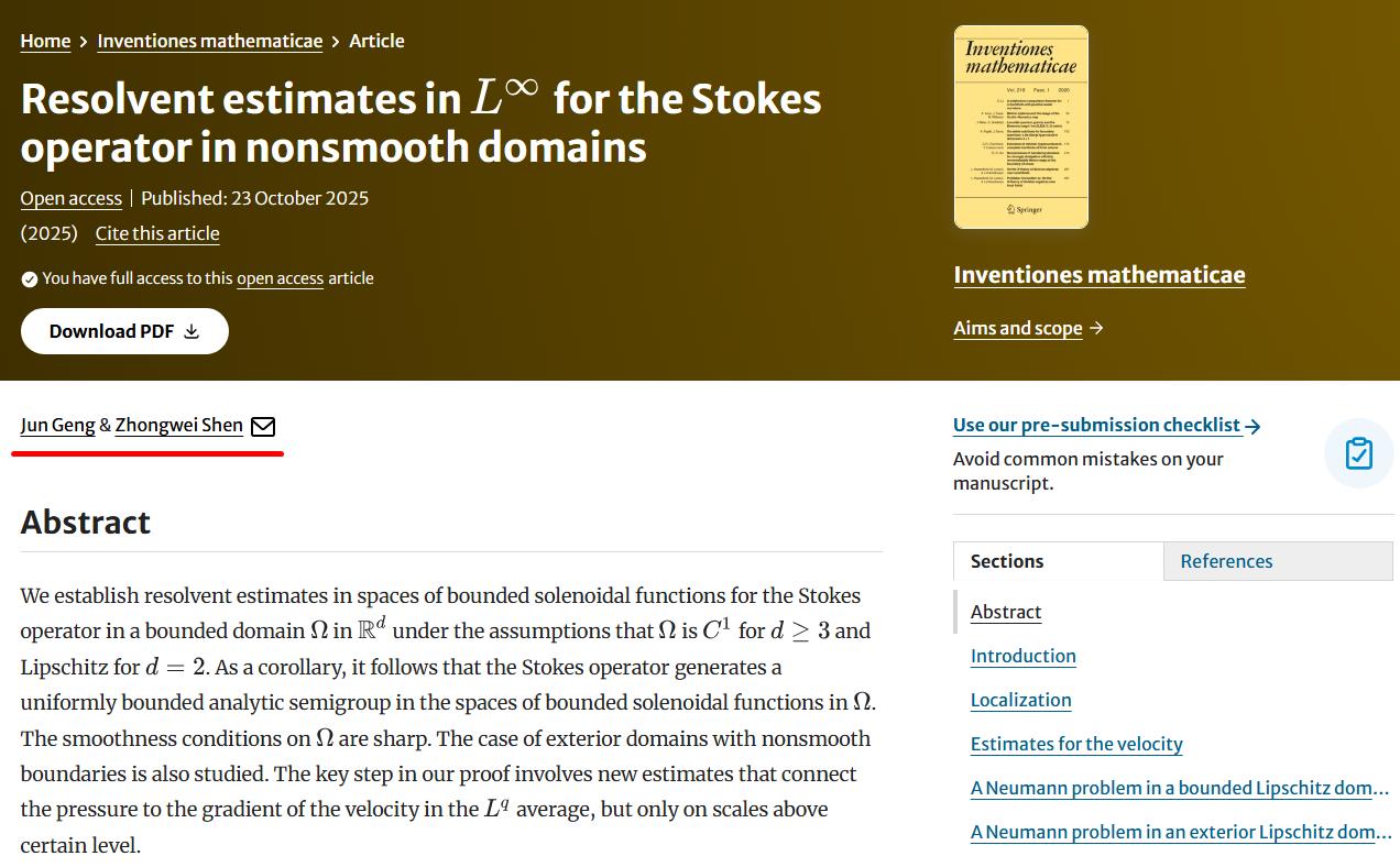 记者10月26日从兰州大学获悉,该校数学与统计学院青年教师耿俊教授与西湖大学申仲伟教授合作,在非光滑区域上带Dirichlet边界条件的Stokes算子的预解估计方面取得重要突破。相关成果于近日发表在国际顶尖数学期刊《数学新进展》上。