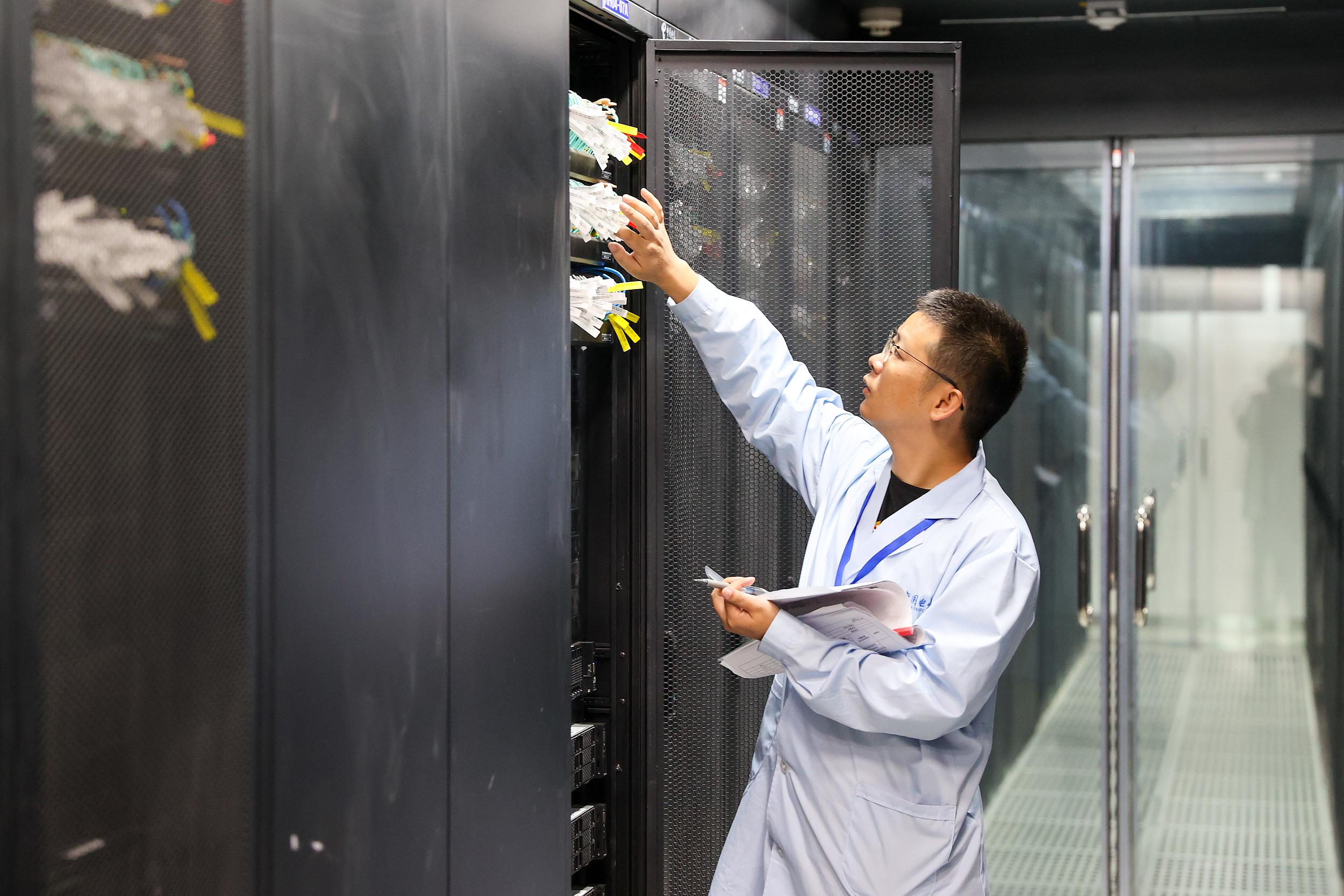 中国电信(国家)数字青海绿色大数据中心内,工作人员在机房巡检。中新社记者 薛蒂摄