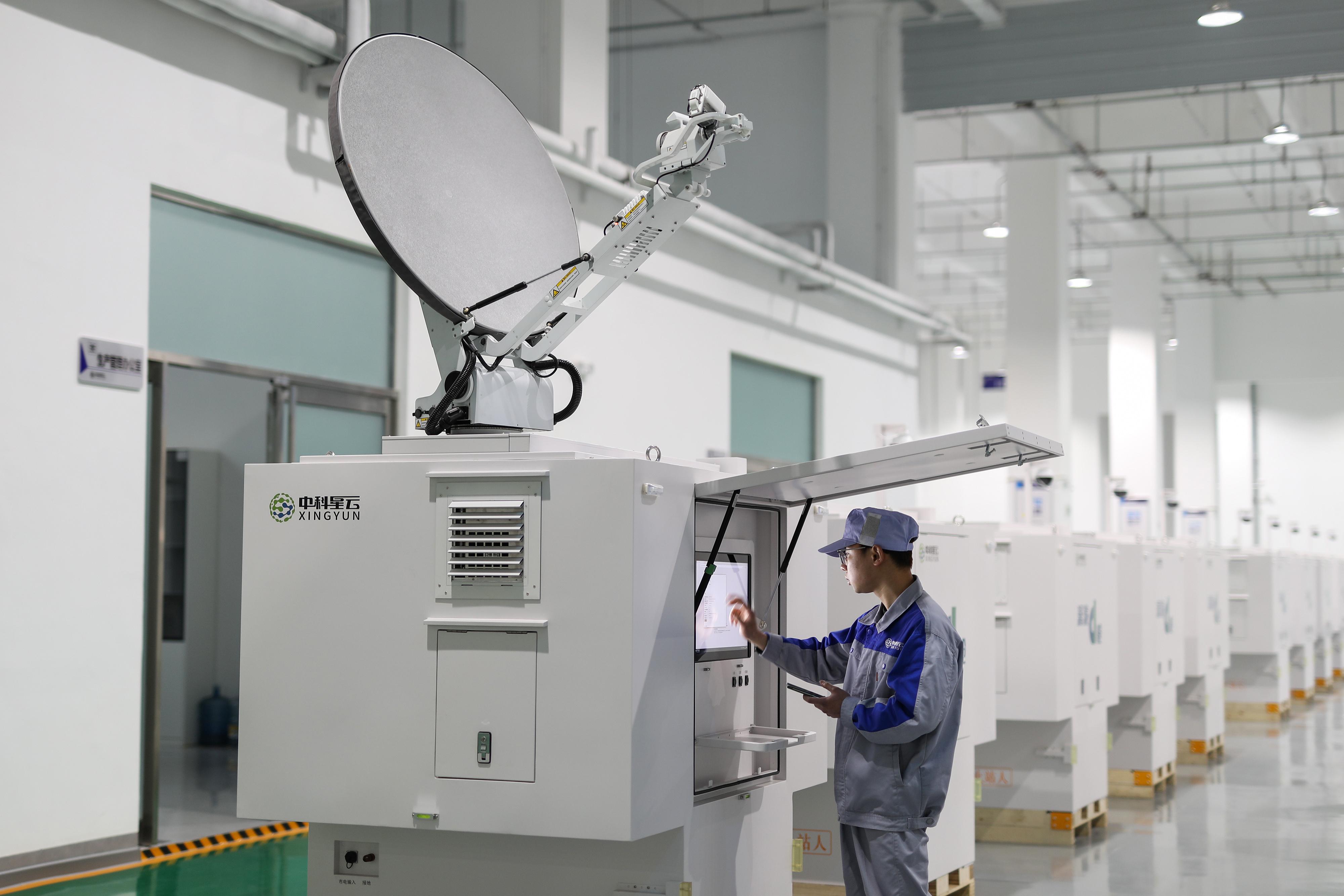 在河南省鹤壁市一智造基地内,工作人员正调试一款装有卫星天线的数据方舱产品。新华社记者 杜潇逸摄