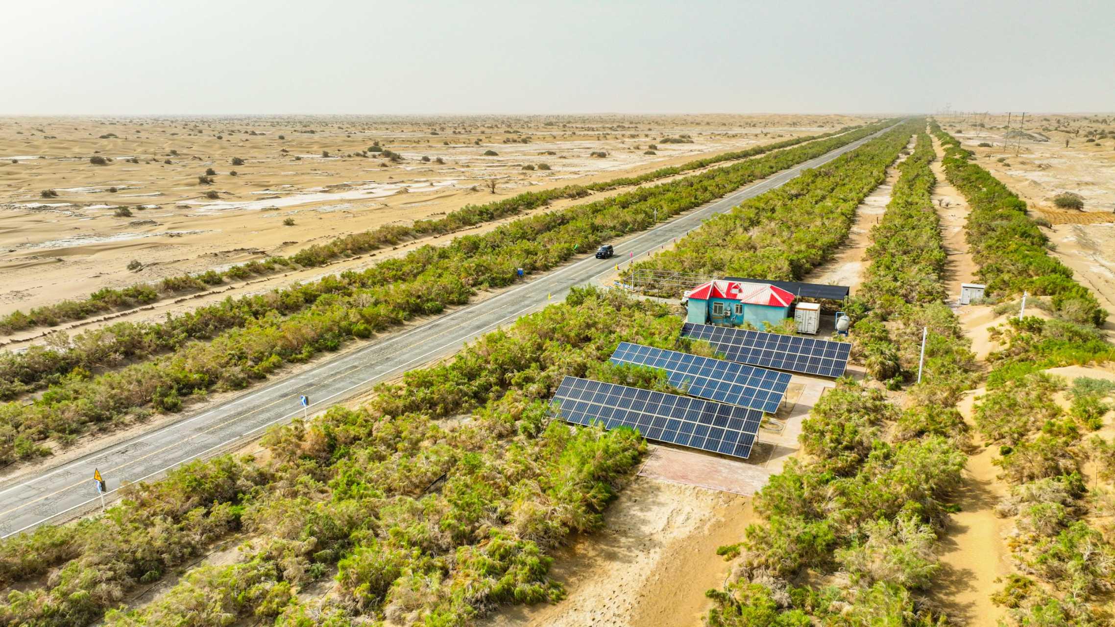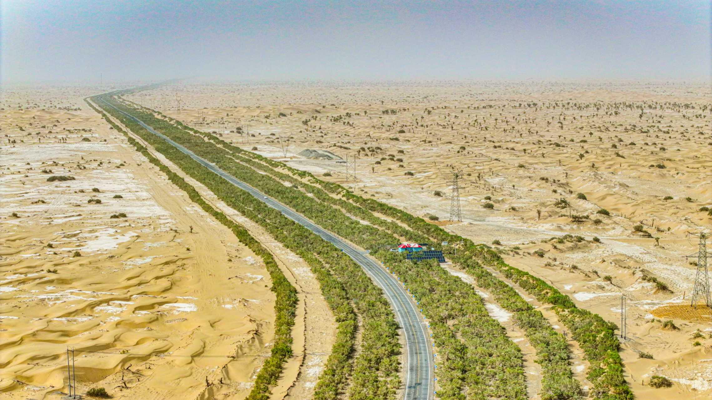 1995年10月,562公里长的塔里木沙漠公路正式通车,打通了新疆南北的阻隔,建成世界上最长贯穿流动性沙漠的等级公路。2006年,为抵御风沙对公路的侵蚀,中国石油塔里木油田在公路两侧建成宽约75米、长436公里的生态防护林带,让2000多万株红柳、梭梭等沙生植物通过滴灌系统扎根沙海。