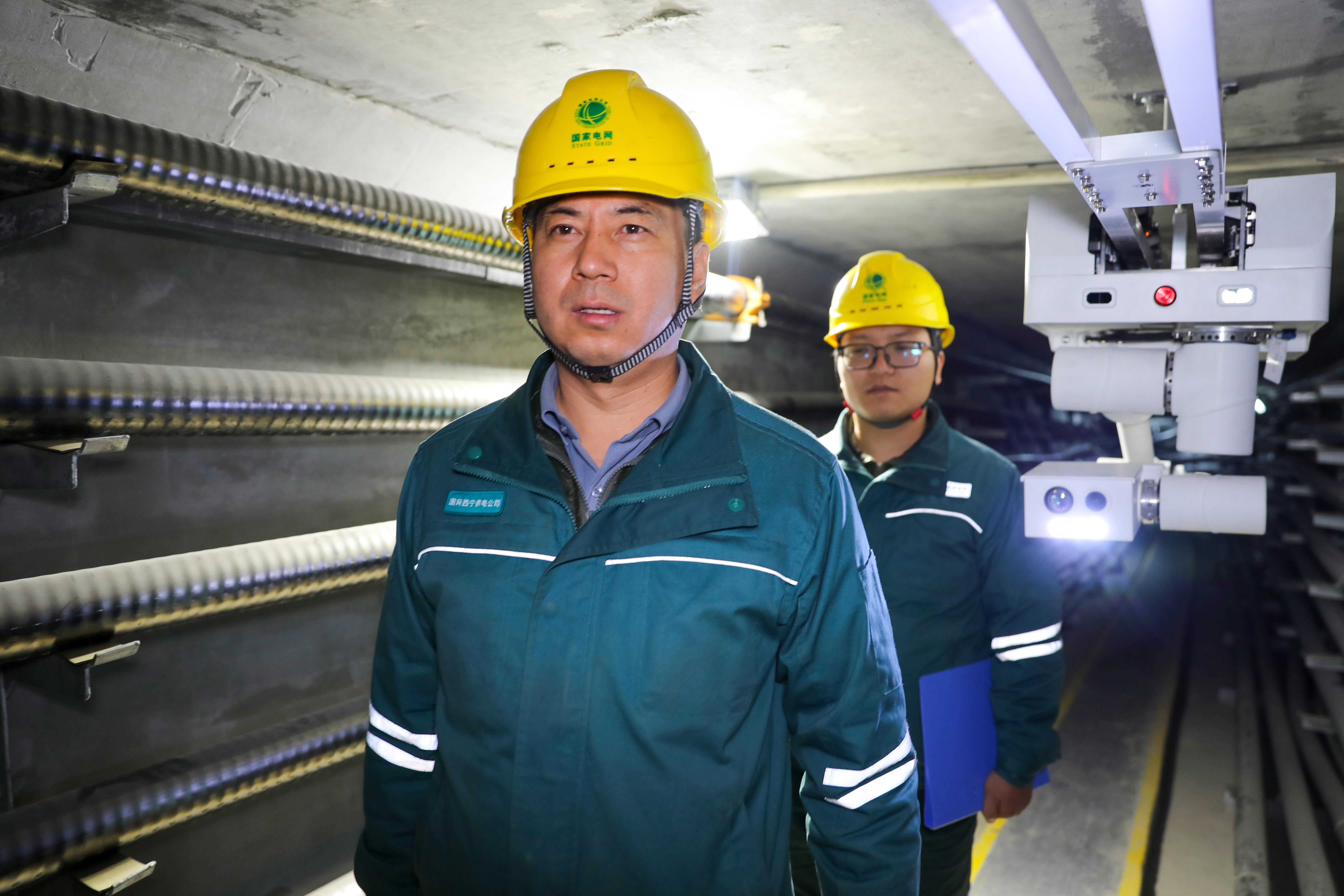 国网西宁供电公司电缆运检中心电缆运检班班长张明帅和班员任晓生,和“智能巡检机器人”一起,在110千伏杨乐线电缆终端开展隐患排查工作。