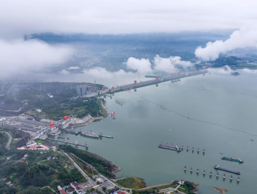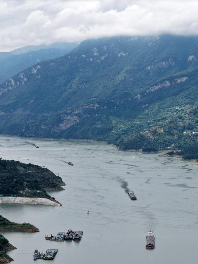 9月11日,船舶行驶在三峡大坝上游的湖北省宜昌市秭归县茅坪镇水域(无人机照片)。