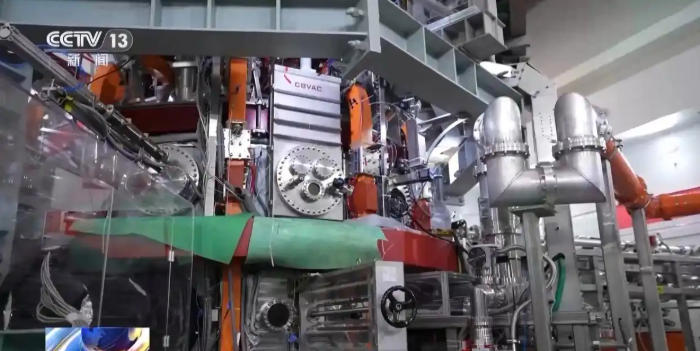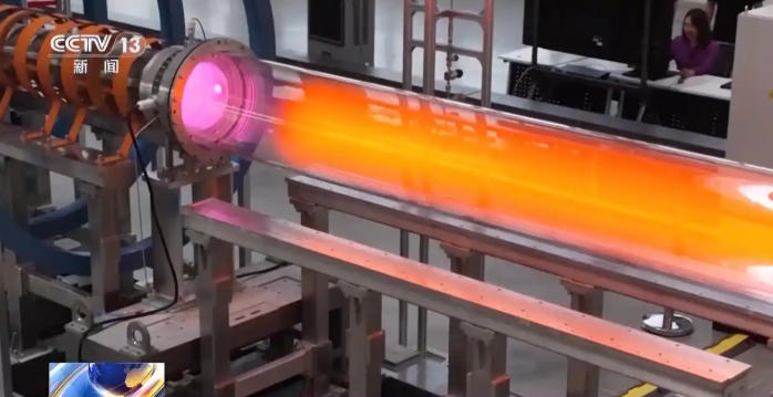 这是强流直线等离子体装置“赤霄”,每平方米每秒钟可极速喷射出10的24次方——即亿亿亿个粒子,一次可连续运行24小时以上,对新研制的“人造太阳”壁材料进行充分检测。